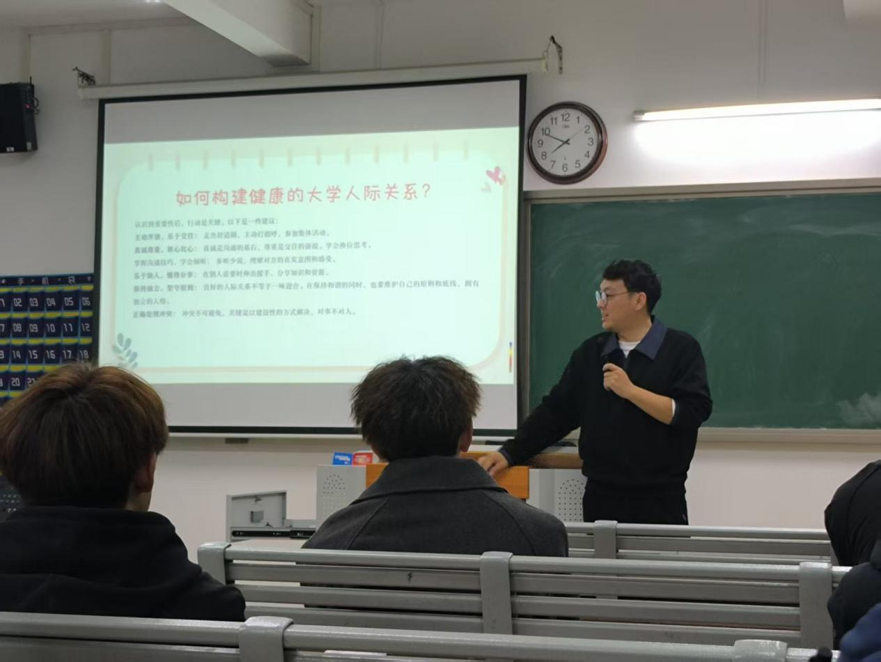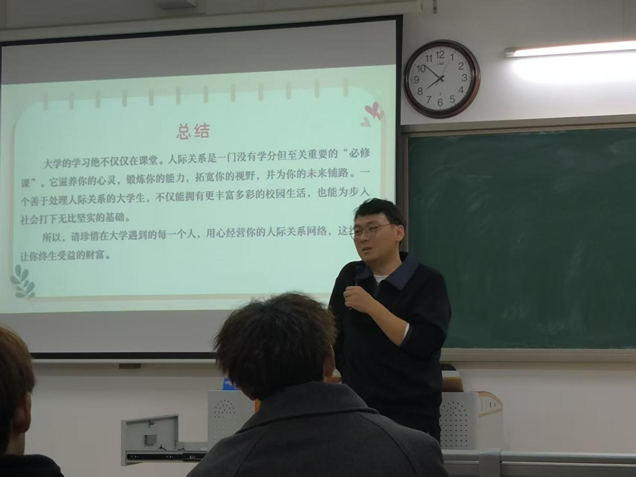 其次,活动聚焦大学生人际关系构建。辅导员和班委引导同学们探讨了如何处理宿舍关系、同学交往等常见问题,分享了有效沟通与矛盾化解的技巧,鼓励同学们以真诚、包容的态度建立健康、积极的人际网络。